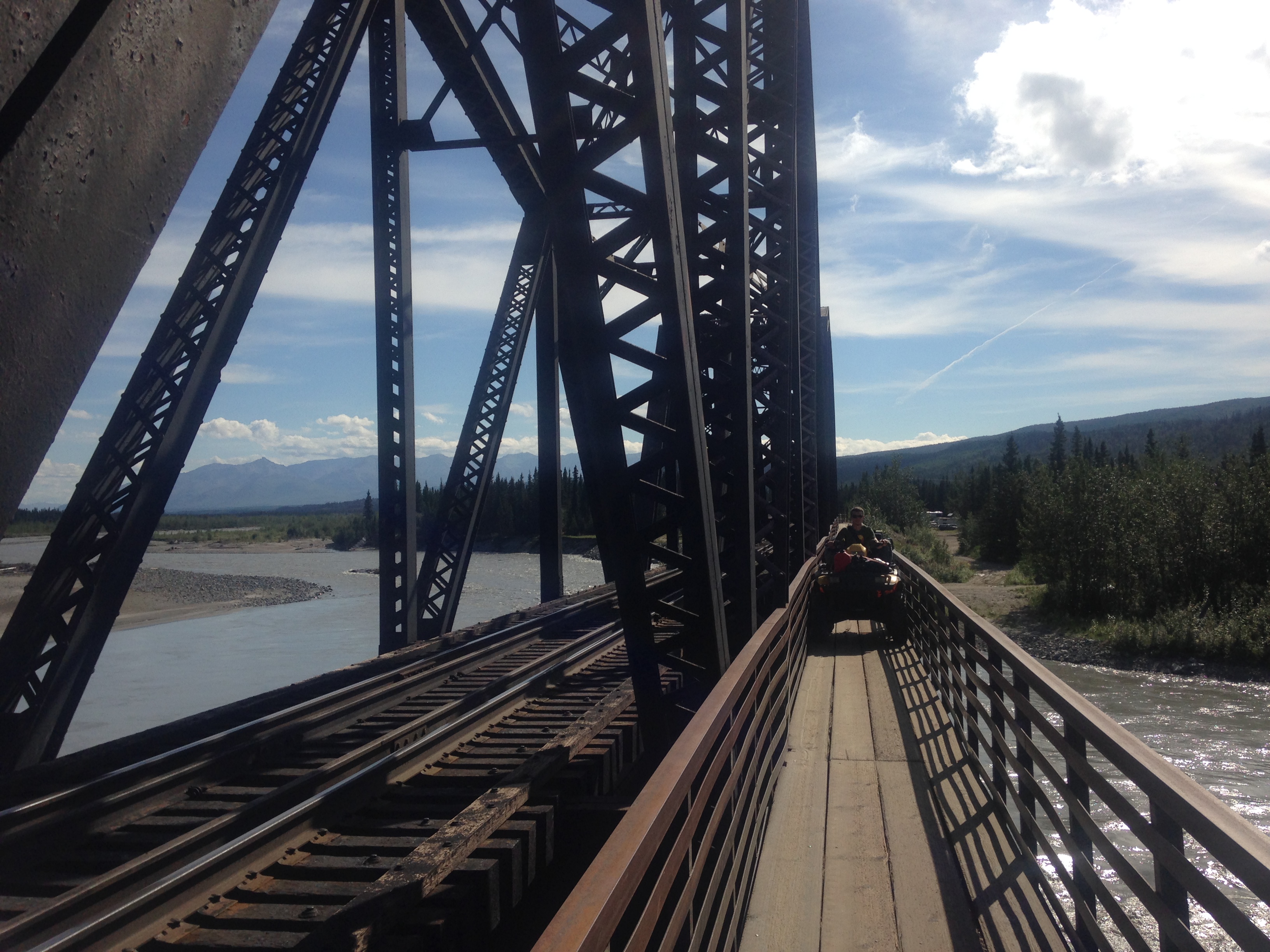 This past week we took a few days and went into the backcountry lands of Alaska. There is a little community just north of Healy, with the name of Ferry. In order to get to Ferry, you must do one of two things to get across the Nenana River. One, you could wait until winter when the river freezes over. Or, two, you could take a atv across the narrow walkway on the side of the train tracks. (You will have to see the picture below to get a closer look at how sketchy it really is.)